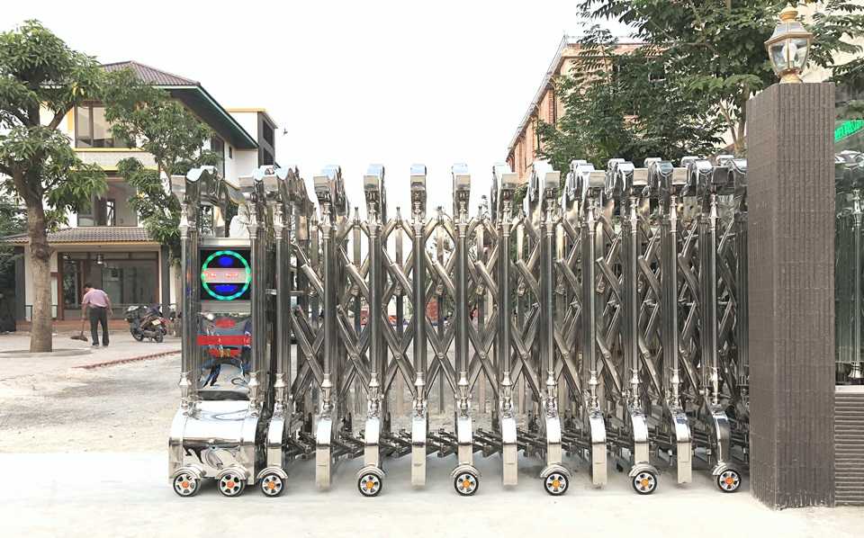 Liên kết chéo đứng trên thân cổng xếp được uốn cong tạo sự mềm mại hòa nhập với tổng thể cổng